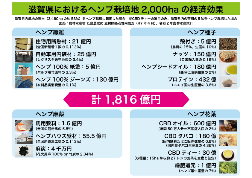 試算の根拠 ※本試算は、すべて小売価格ベースの経済効果です。・住宅用断熱材:1棟当たりの繊維1500kg×1400円/kg×1000棟・自動車内装材:1台当たりの繊維20kg使用した内装材100,000円×2万5千台・ヘンプ100%紙袋:1袋当たり0.1kgのヘンプパルプ使用 100円/枚×紙袋500万袋・ヘンプ100%ジーンズ:1着当たり0.3kgのヘンプ紙糸使用、10000円/着×130万着・馬用敷料:1頭当たり麻チップを年1.5トン使用、38000円/年×4200頭・ヘンプハウス壁材:1棟当たり麻チップを7トン使用 麻壁材公費5,550,000円×5千棟・麻炭:3800円/kg×10.5トン・殻付き種子:500円/kg×100トン・ヘンプナッツ:6000円/kg×250トン・ヘンプシードオイル:10000円/kg×180トン・ヘンププロテイン:6000円/kg×720トン・CBDオイル 10000円(1本30ml、1000mgCBD配合)×600万本・CBDタバコ:1本当たりヘンプ葉1gを使用、1箱20本入り、600円/箱×1億5千箱・緑肥:ヘンプ後作小麦の収量が10%増加した場合の増収効果を想定、小麦1ha当たり収量を5トンとして計算 増収分500kg/ha×小麦買い入れ価格100円/kg×2000ha